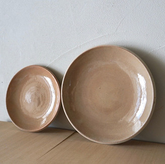 プレートはフラットなタイプと少し深さのあるタイプの2種類。淵や裏側に土のざらっとした質感が生かされています。フラットなタイプはワンプレートやお肉やお魚のメイン料理にちょうどいいサイズ感。少し深さのあるタイプは2サイズあり、メインのお料理から副菜まで幅広く盛り付けやすいサイズ感です。